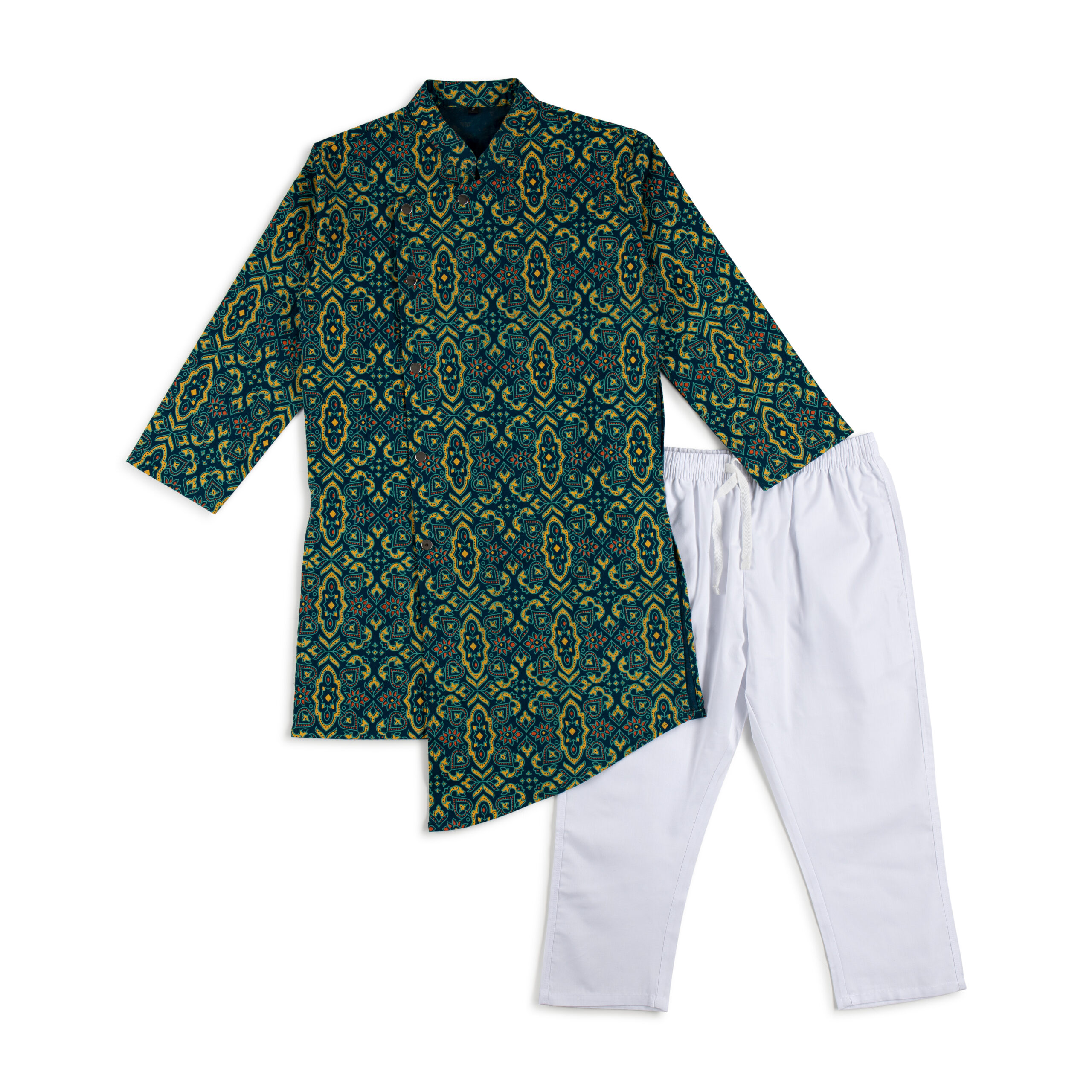 A premium statement Panjabi designed with a distinctive asymmetric draped front that brings a modern edge to traditional wear. The elegant two-layer front construction enhances depth and structure, giving the outfit a refined designer finish. Clean hidden snap button closures ensure easy wearing while maintaining a polished, seamless appearance.