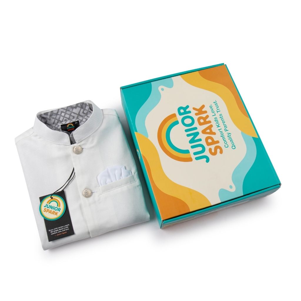 A timeless Eid set featuring a printed panjabi paired with a clean solid white koti and durable cotton payjama. Designed to give kids a classy, polished festive look while keeping them comfortable all day long.