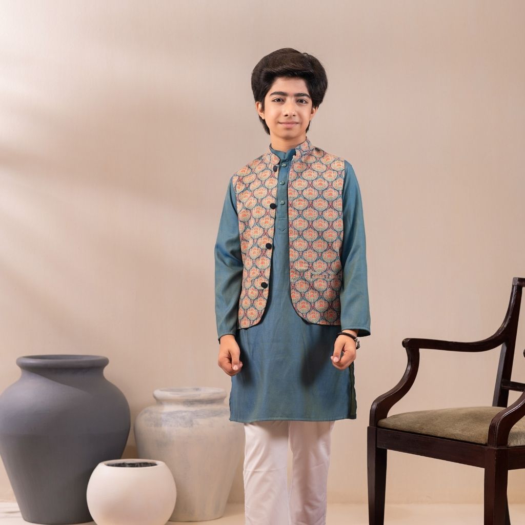 This premium Panjabi set is crafted from an ultra-soft shiny fabric that creates a stunning two-tone effect under sunlight — a rich Turkish green with a subtle golden glow. Designed to deliver a royal festive appearance, it is perfectly matched with a Heritage Medallion printed Koti and a durable white cotton payjama. The complete set offers a refined, elegant look ideal for Eid and special occasions.