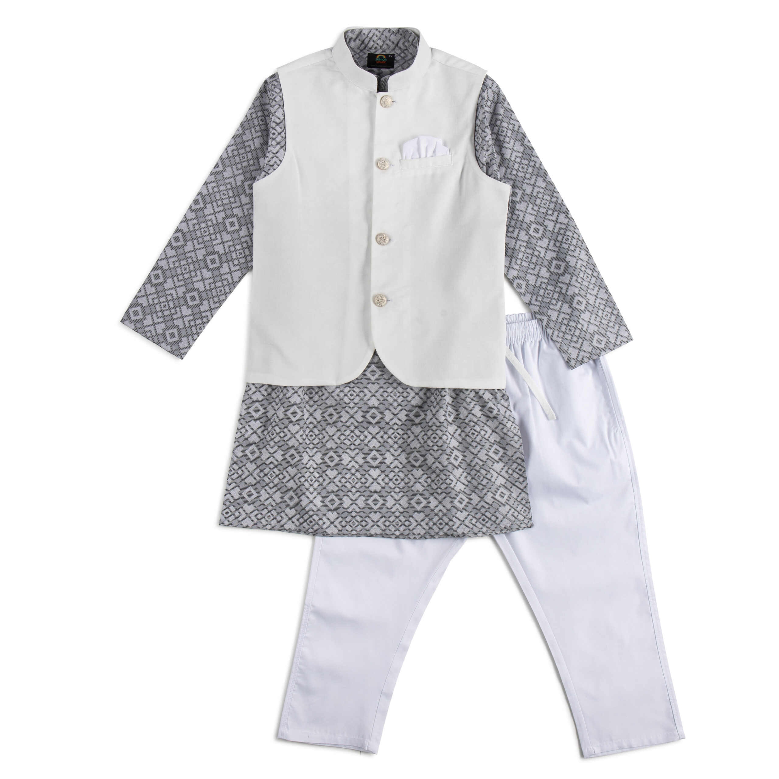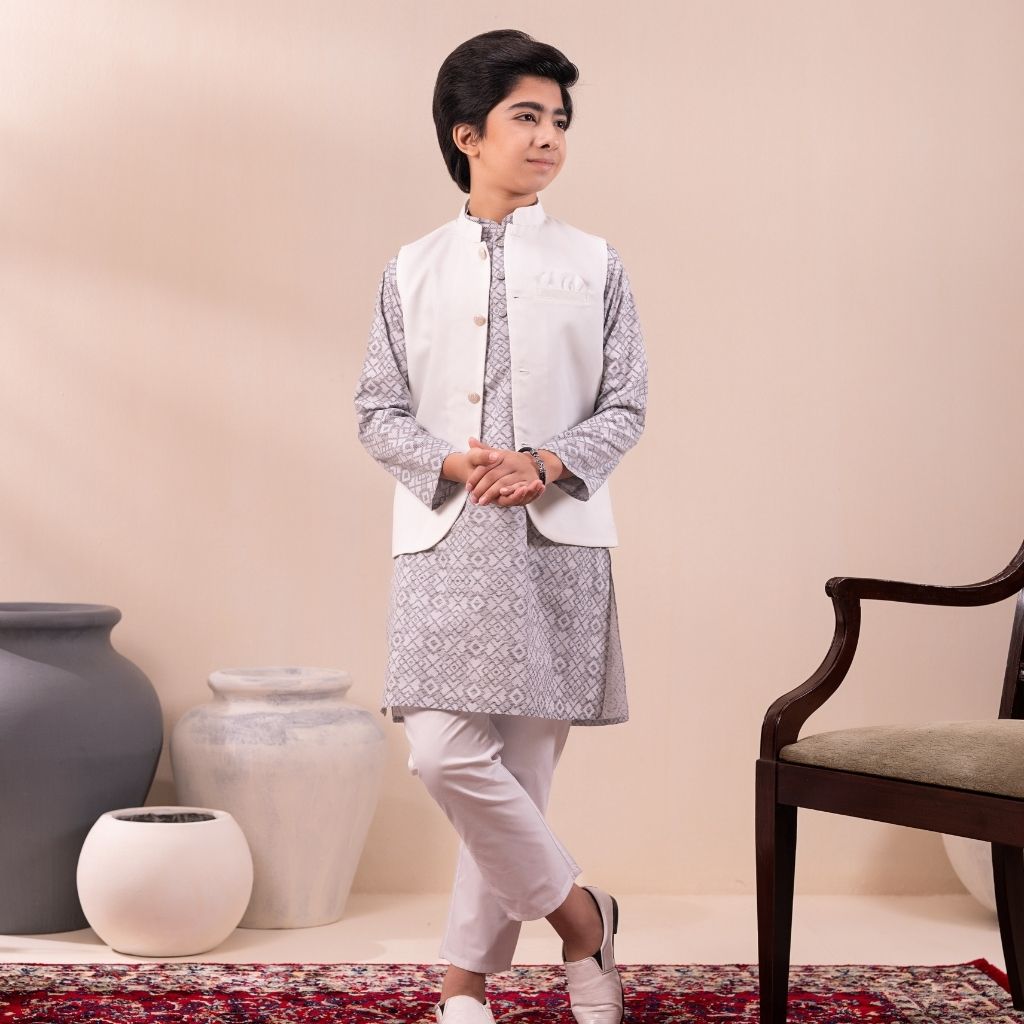 A timeless Eid set featuring a printed panjabi paired with a clean solid white koti and durable cotton payjama. Designed to give kids a classy, polished festive look while keeping them comfortable all day long.
